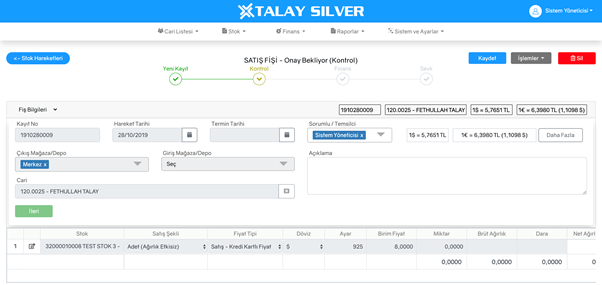 Regarding to chosen stock, selling type, price type and currency and user enters the carat of silver(e.g. 925), quantity(quantity is for just information), weight and tare. With this informations the system calculates pure silver weight. Regarding to entered unit price inside stock, system calculates the pure silver amount, workmanship amount and calculates the account balance on the system.